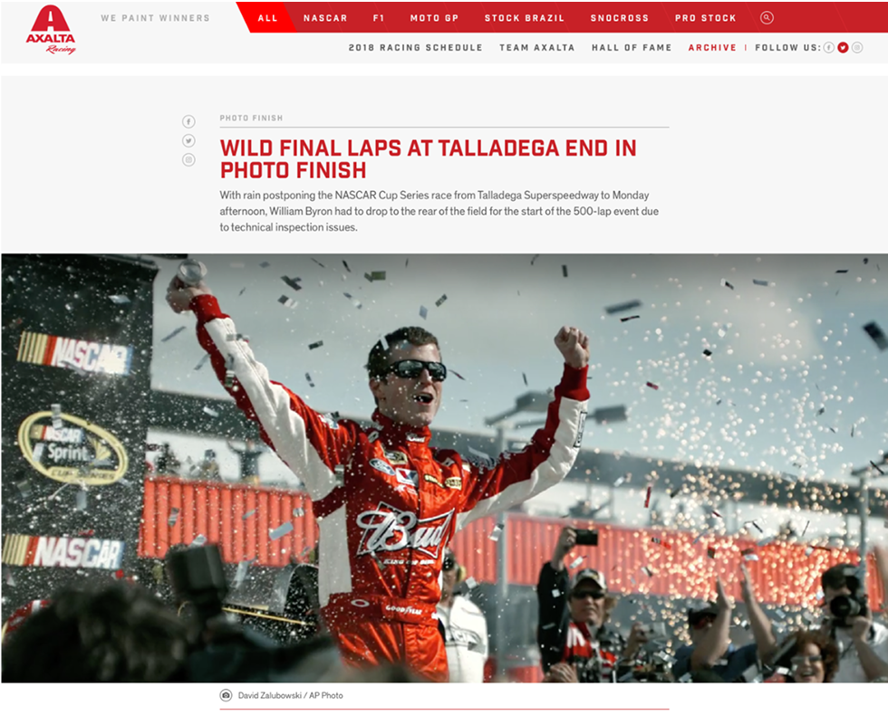 Axalta Racing is the motorsports division of Axalta Coating Systems, a global leader in coatings. It sponsors Hendrick Motorsports' No. 24 Chevrolet in the NASCAR Cup Series and partners with teams in Formula 1, MotoGP, and the World Endurance Championship.