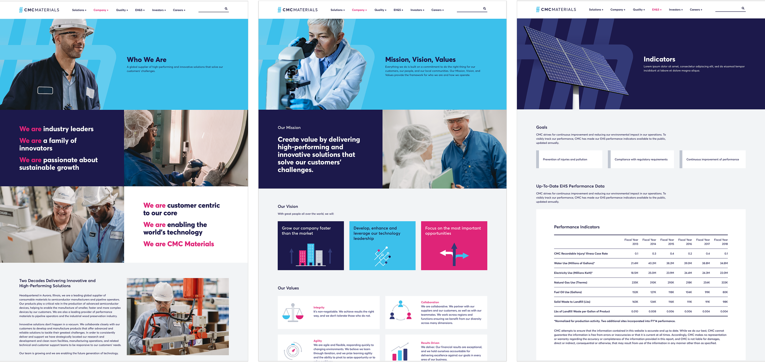 While the content on third-level pages remained unchanged from the previous site, we leveraged the new identity system to elevate their visual presentation and align them with the refreshed brand. The homepage and section landing pages were completely reimagined, placing greater emphasis on CMC employees and company values. This approach reflected the site’s role as a key recruitment tool, helping attract talent while reinforcing the brand’s culture and mission.