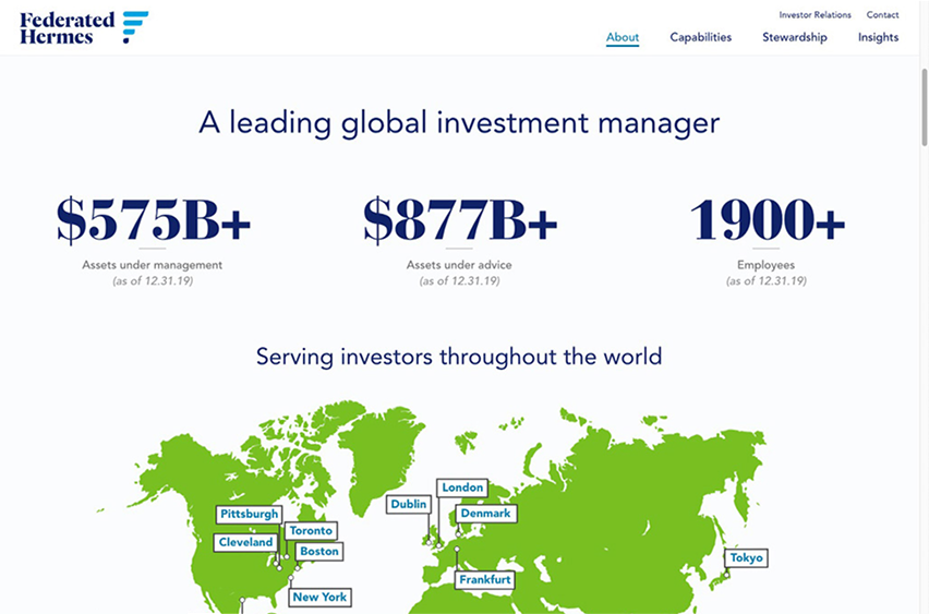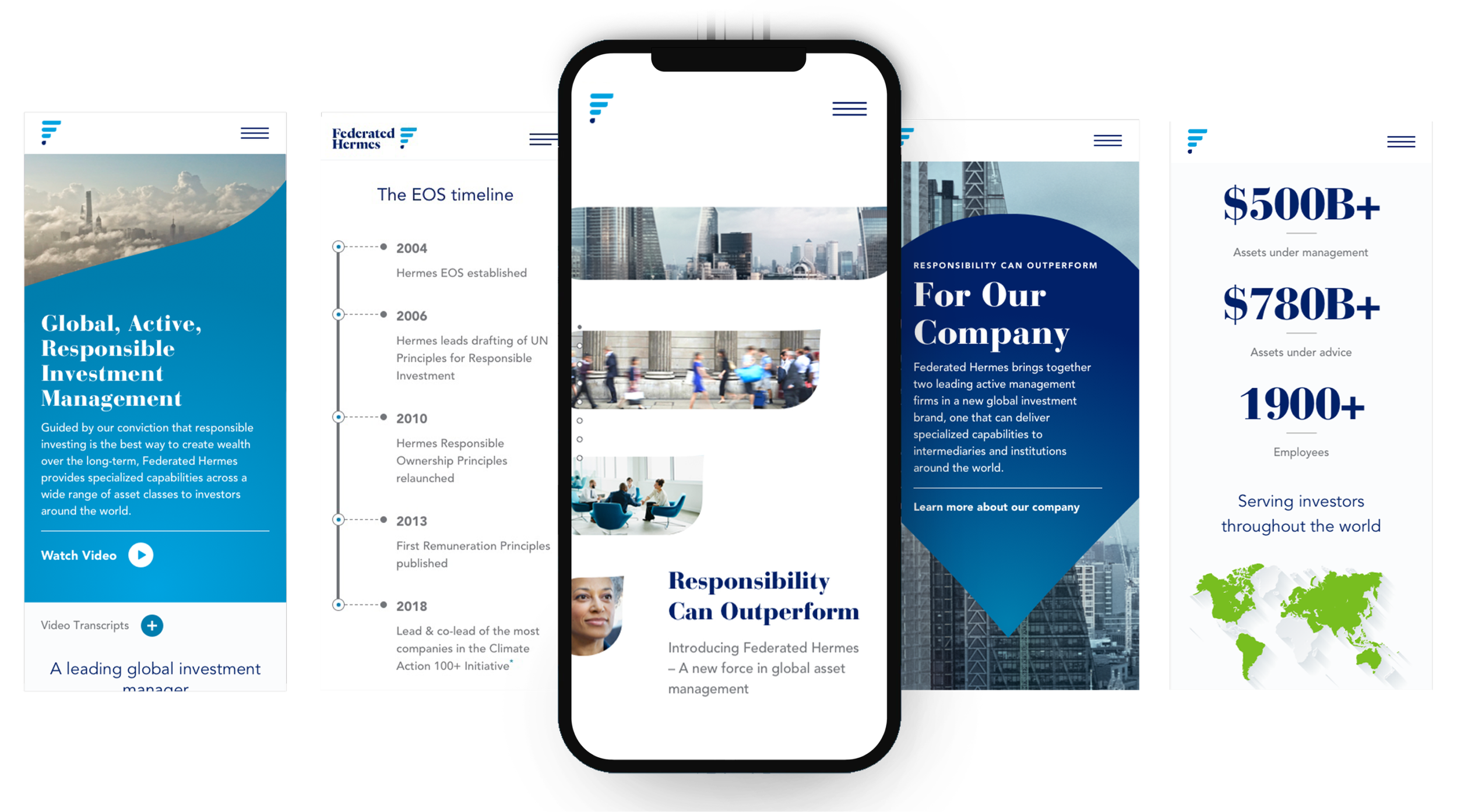 Along with developing their brand identity, we created a site that conveys the rationale behind the new combined firm, offering multiple perspectives on responsible investing in concise, easy-to-digest segments. Key features include interactive infographics and intuitive navigation that align with Federated Hermes' mission of delivering outstanding risk-adjusted returns through active ownership and sustainability.