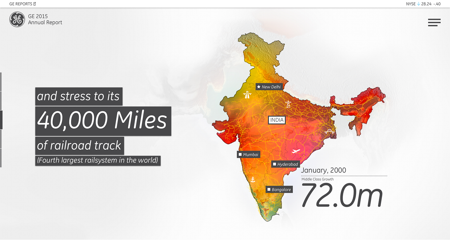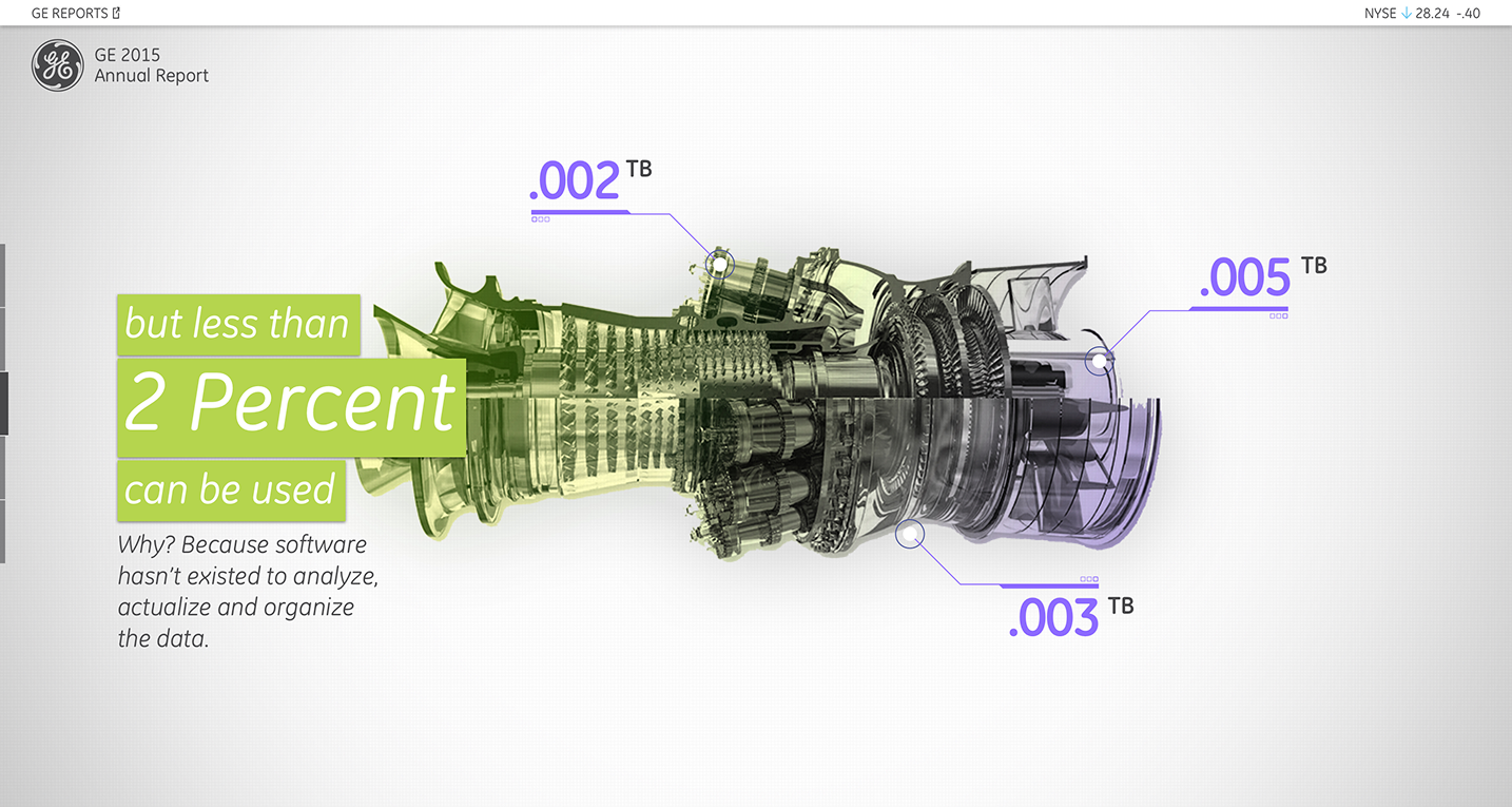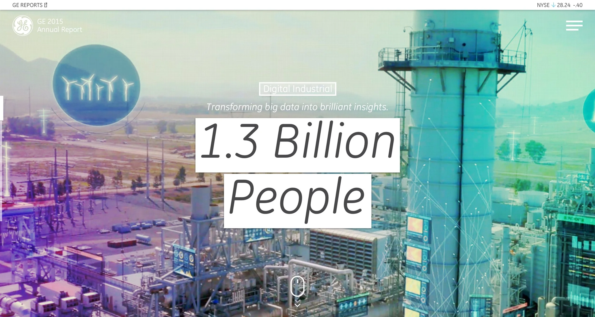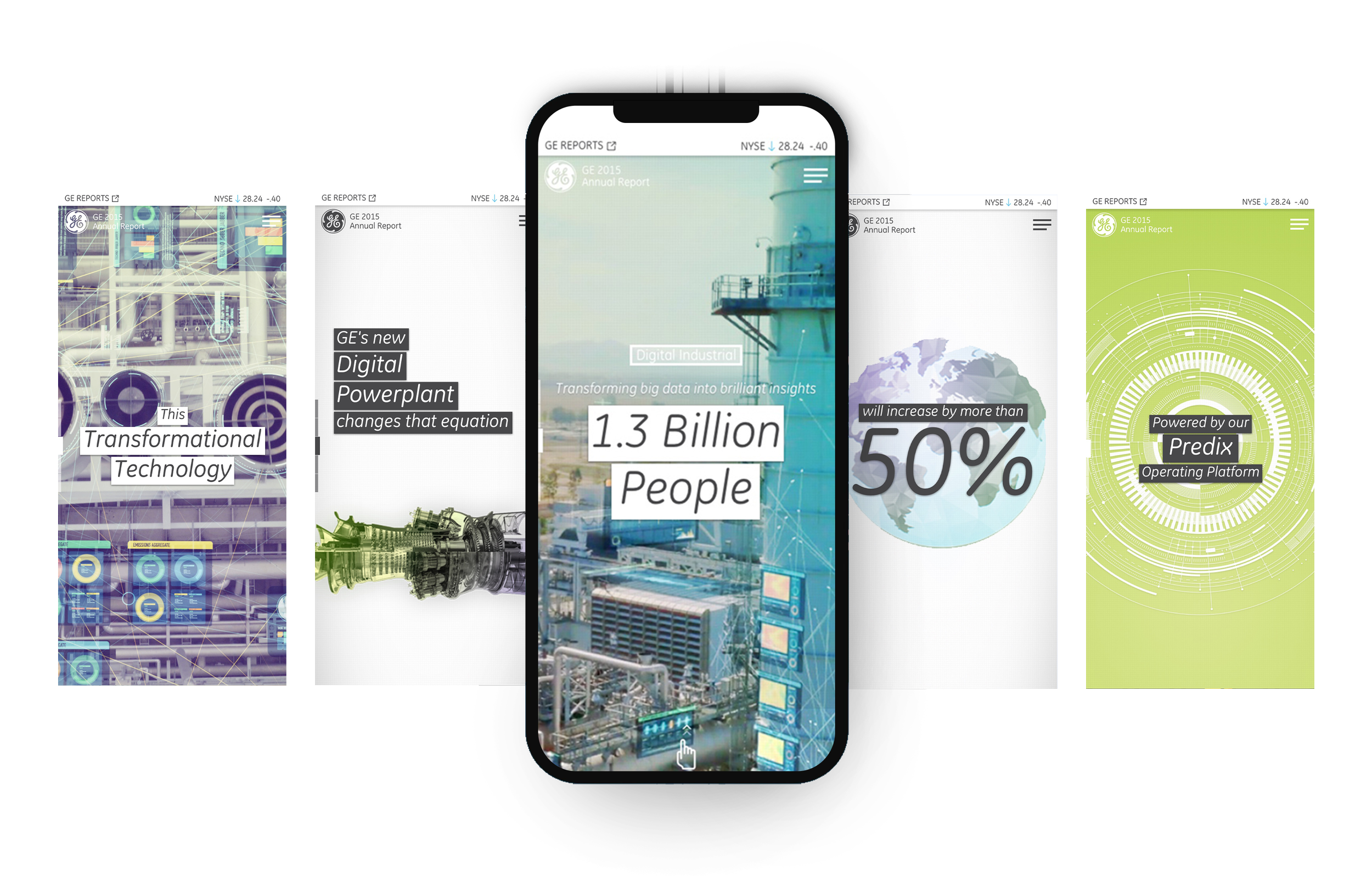 For this annual report, in an effort to transition to a “digital-first” strategy and better capture their audience’s attention, GE spotlighted two key stories that defined the year: The GE Store and Digital Industrial. These stories were presented in a visually engaging format, aimed at simplifying complex ideas while emphasizing GE's innovative advancements.