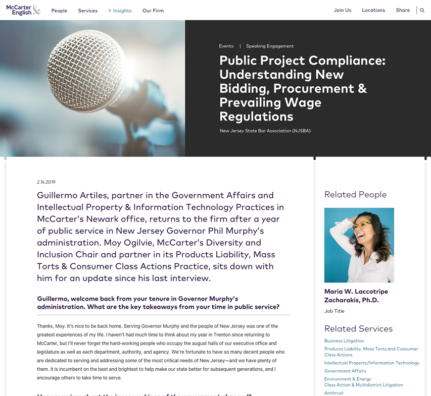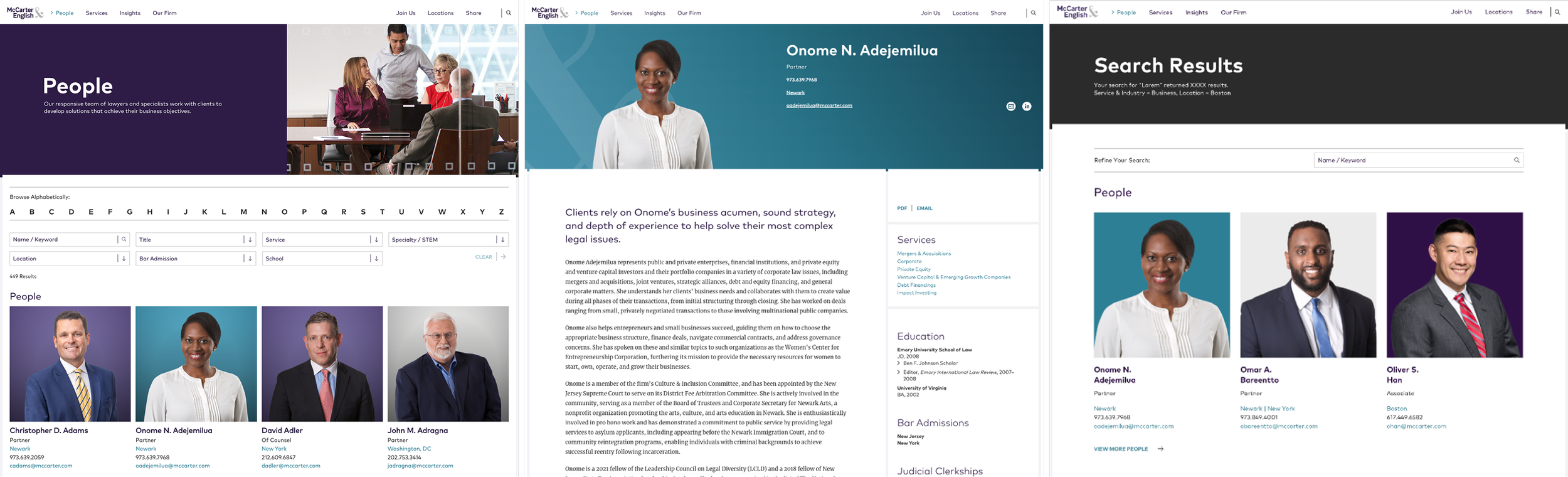 McCarter & English needed a modern, user-friendly website reflecting its new brand identity, created by Addison. The site balanced innovation with values of quality, integrity, and client service. It was simple, mobile-responsive, and featured intuitive navigation to highlight the firm’s national and regional strengths. The goal was to differentiate the firm through cutting-edge design for a seamless user experience.