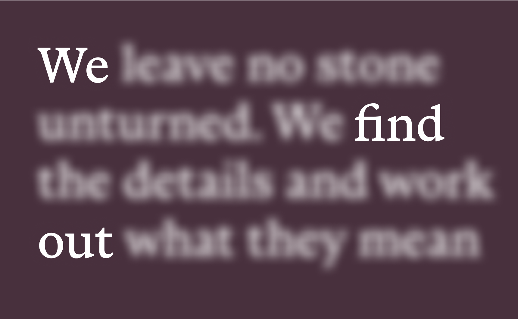 A secondary graphic style was created by subtly blurring specific keywords within a statement. Whether highlighting a single word or revealing a hidden message, this technique effectively visualizes Nardello’s investigative expertise.
