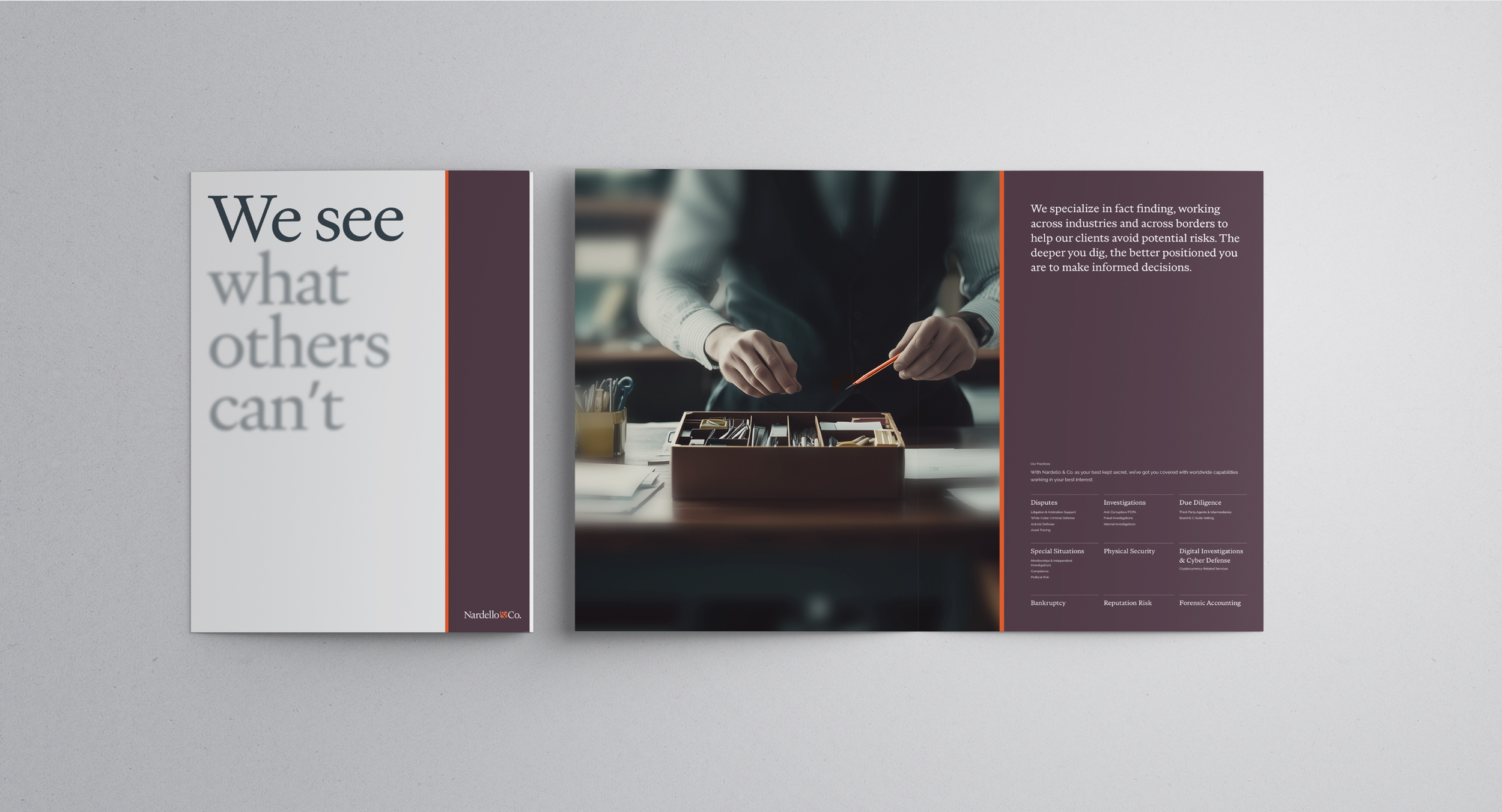 Nardello & Co. sought a rebrand that authentically reflected the caliber of their investigations. Aiming to break away from the clichéd imagery often associated with private investigation firms, they desired a fresh, sophisticated identity that embodies their commitment to transparency, thoughtfulness, and integrity.