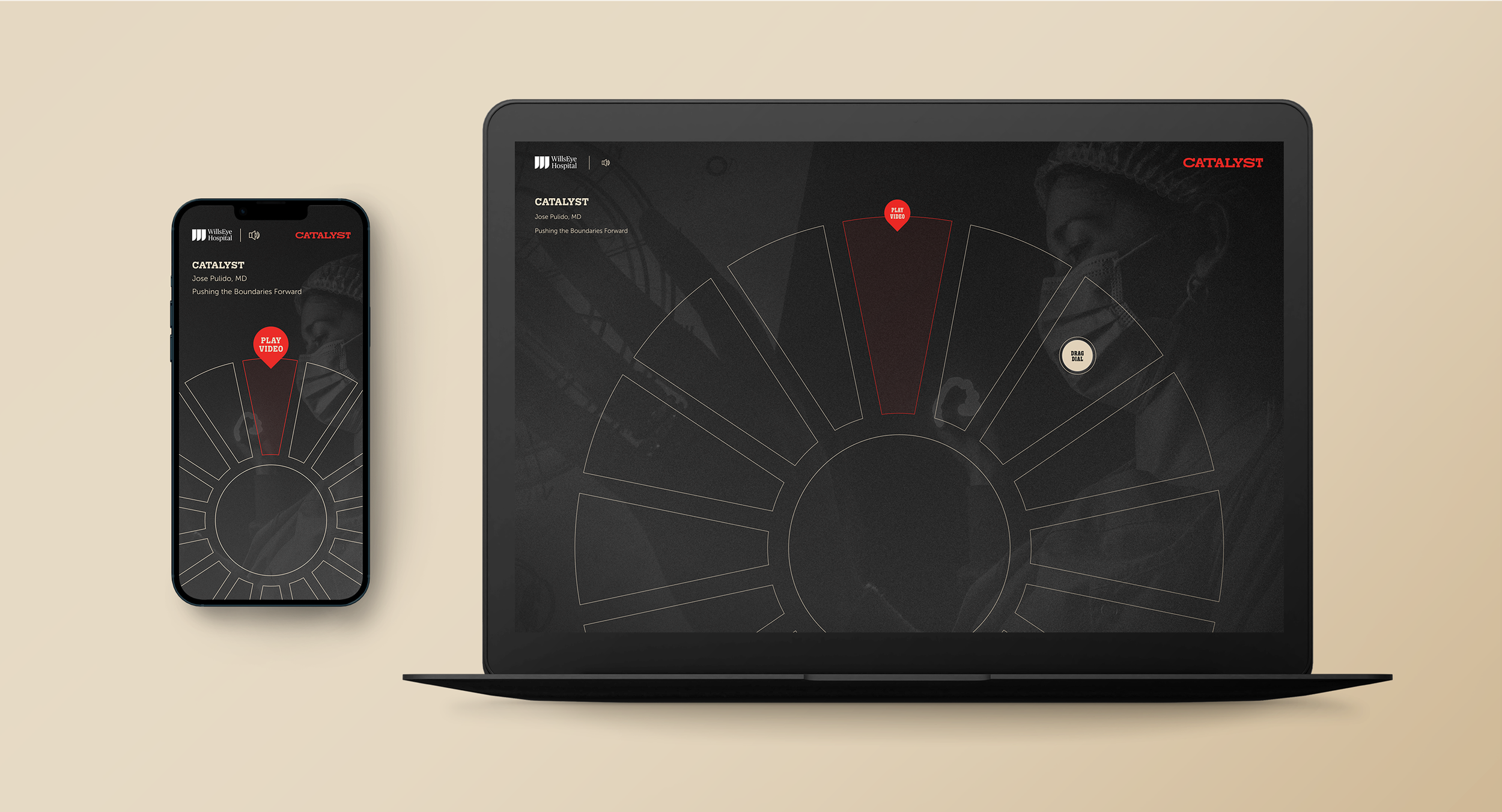 This UI was used to showcase 16 videos, featuring a variety of interviews and experiences from notable figures at Wills Eye, highlighting their expertise and insights.